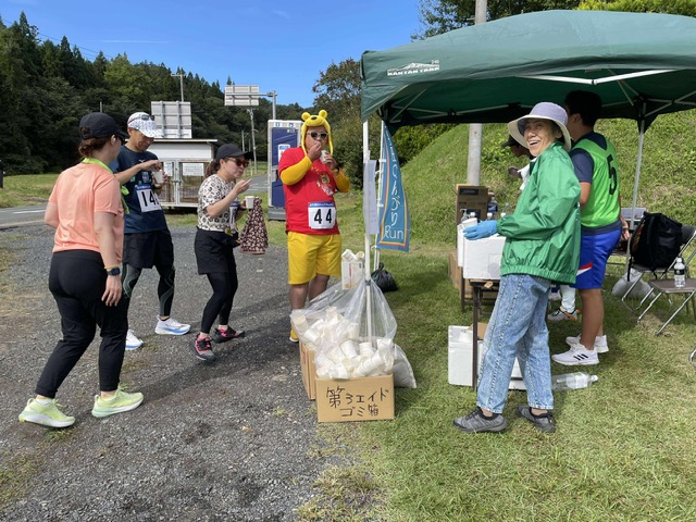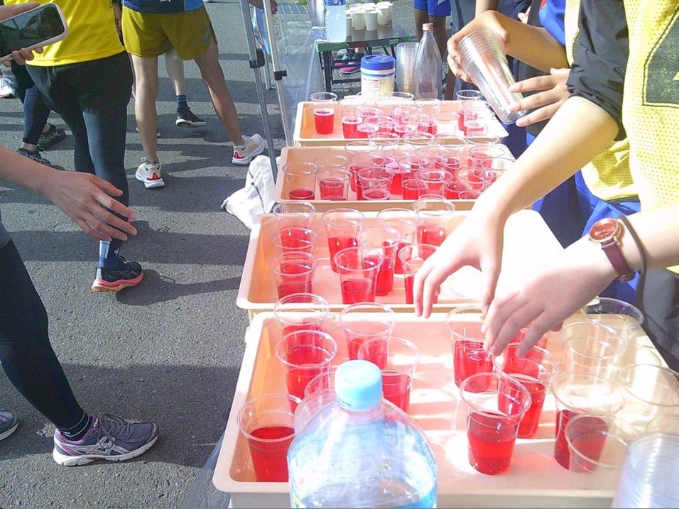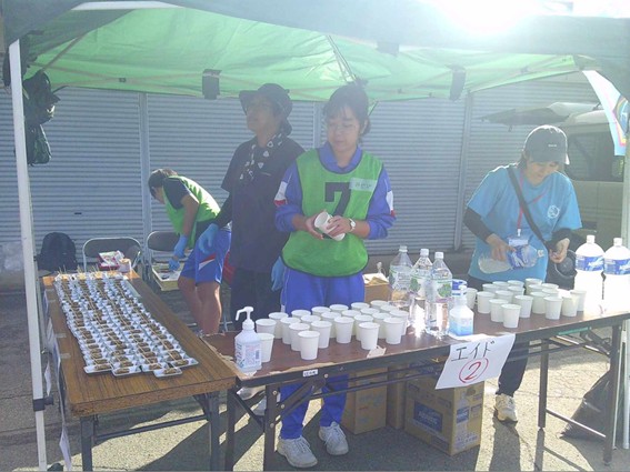 ランナーの皆さんがお待ちかねだったエイドのトップバッターということで、笑顔と活気が広がる。