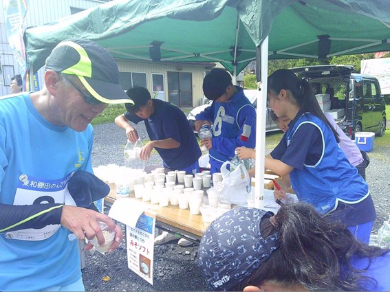 頑張って坂を登ったランナー達を待っていてくれるのは、東和の冷たいご褒美。折り返しの第4エイドで配られるのは、道の駅名物、佐々長醸造の味噌を使った味噌ソフトだ。