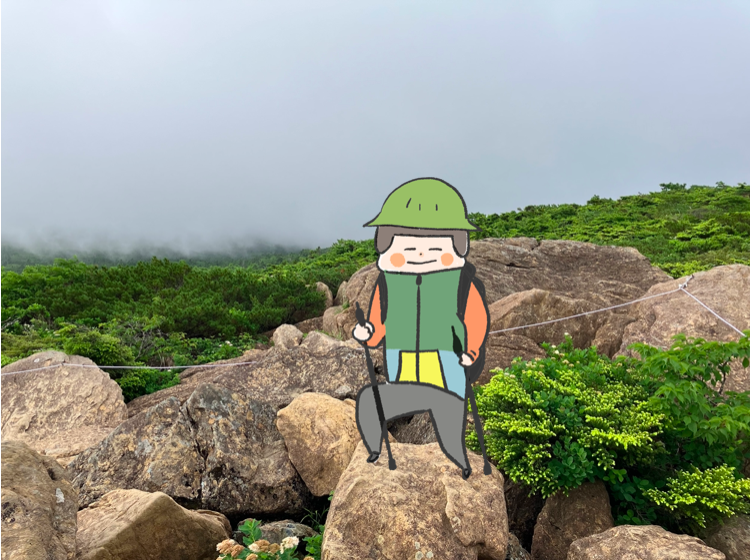 山頂に着くと、心配していた雨が降り始めました。岩陰に避難してまず休憩を取ります。避難小屋は混み合っていたので、お昼ごはんは岩の下で食べることに。惣菜パンとお菓子。簡単にすぐ食べられるものにして正解でした。雨具は持参していたのですが、問題は下山です。早池峰山の岩は濡れると非常に滑るので、怪我なくいけるか心配でした。山頂にもう少しとどまりたい気持ちがありましたが、安全を考えて早めに山を降りました。トレッキングポールも滑るので場所によってはリュックにくくりつけ、ゆっくりゆっくり動きます。浮石もあるので、足首をぐきっとすることもありました。鉄梯子も濡れていて、滑ったらどうしようと半泣きになりながら降りました。