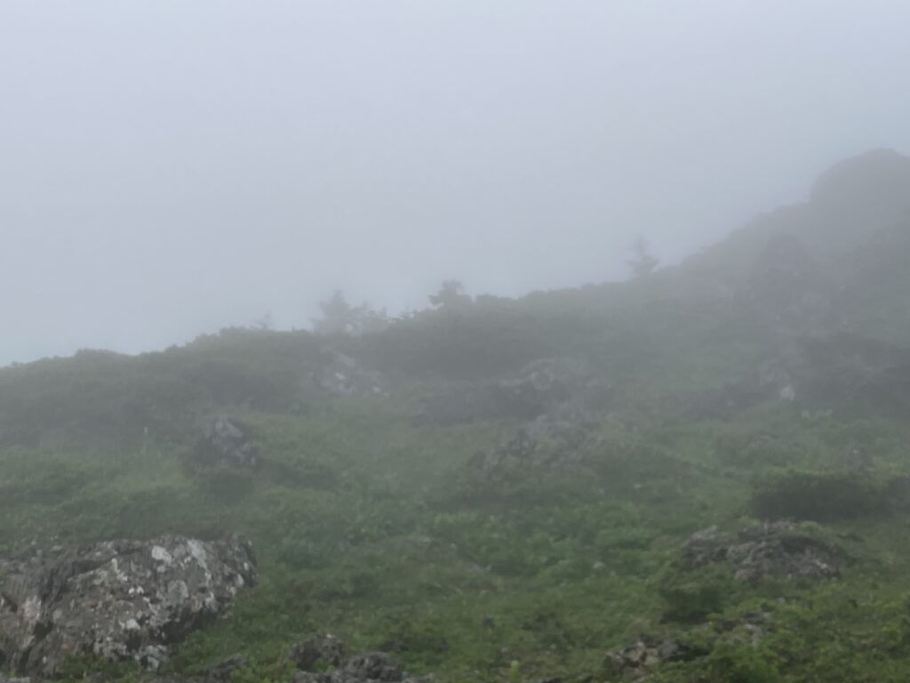 天気に恵まれることは期待していませんでしたが、森林地帯を抜けたところでは予想通りガスっていました。風も相当強かったですが、気温も高かったので逆に心地よく感じます。ただ、油断していると吹き飛ばされそうなくらいでしたので、焦らずに進みました。今日の目標は登頂することではなく、高山植物を自分なりに写真におさめて怪我なく下山することでした。
